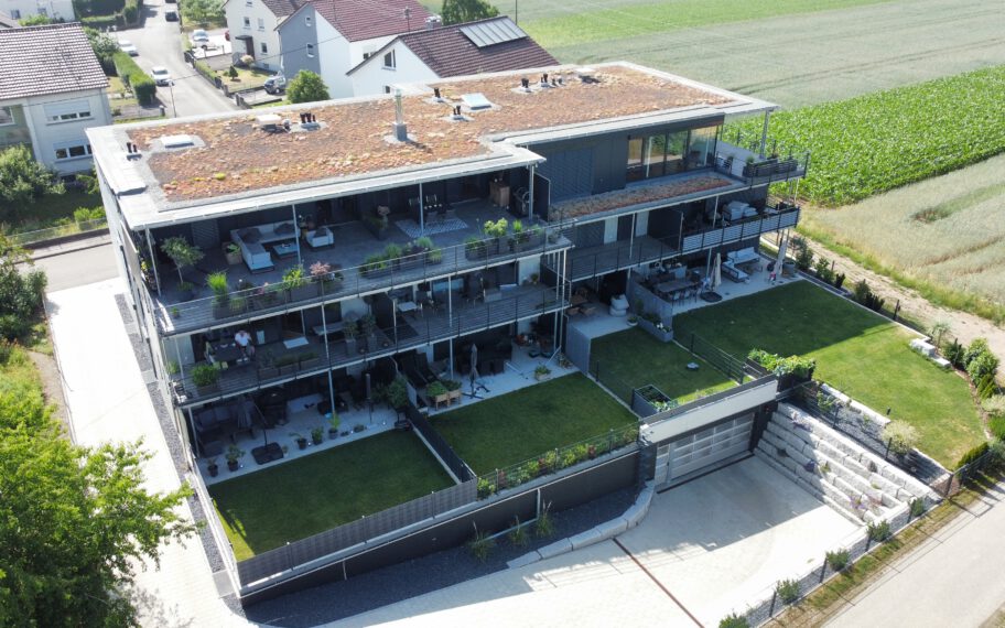 Errichtung eines Einfamilienhauses in massiver Bauweise mit Stahlbetonwänden im Untergeschoss, Erdgeschoss und Dachgeschoss. Die Innenwände wurden in Trockenbauweise errichtet. Die Fassade erhielt eine hinterlüftete Wärmedämmung mit Trespaverkleidung. Das Gebäude besitzt eine Dachterrasse, die einen Ausblick ermöglicht. Ein Garagentor ist direkt in die Außenfassade integriert.