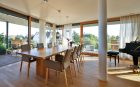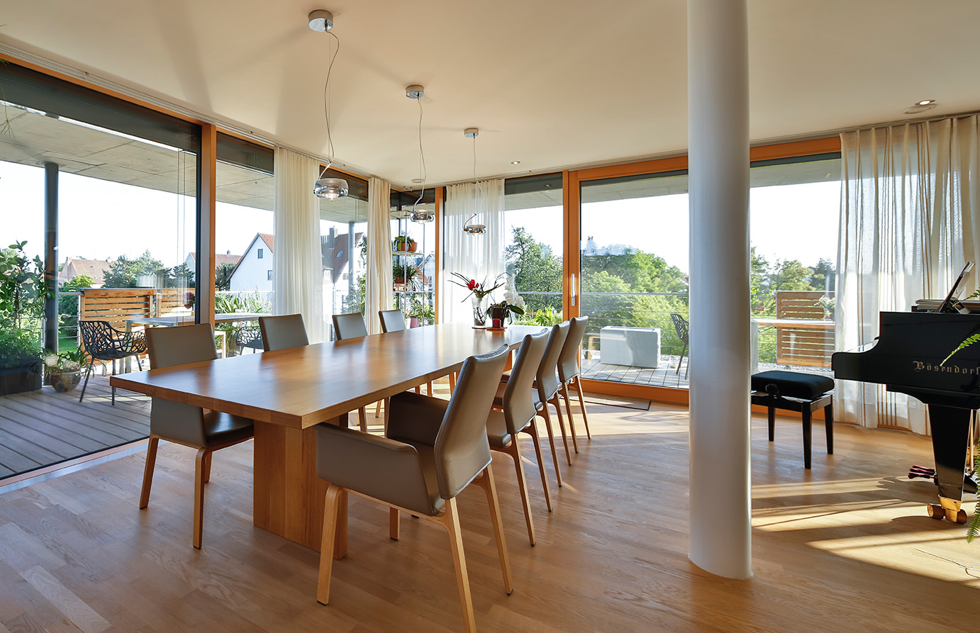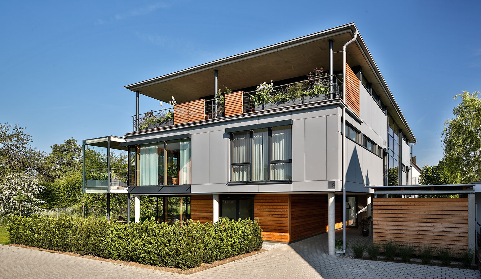 Stahlbetonskelettbau, kerngedämmte Stahlbetonhohlwände, Fassade in Holz-Aluminium.