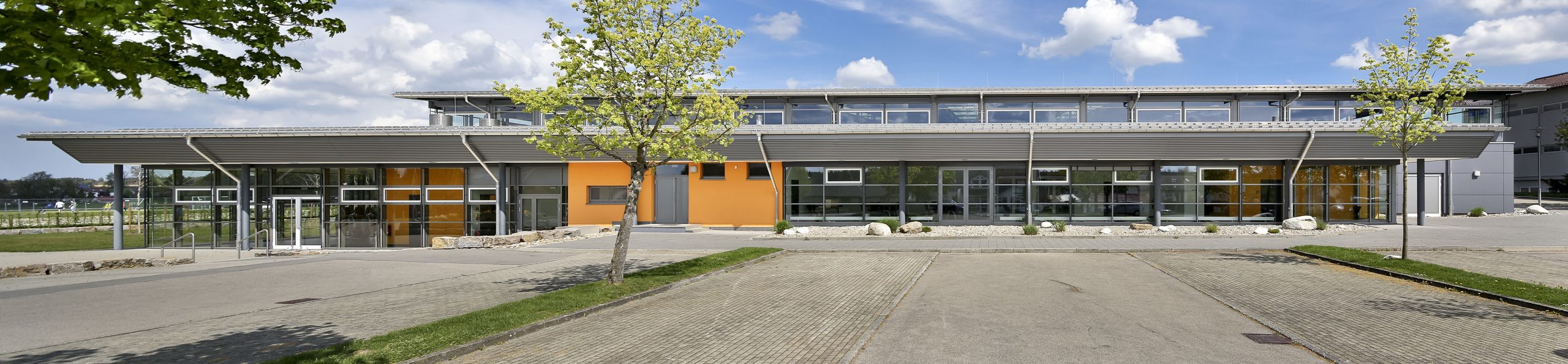 Veranstaltungshalle für ca. 960 Besucher mit Küche, Mehrzweckraum und Außensportumkleiden sowie Außenbereich mit Festwiese und Stellplätze. Fortführung des vorhandenen Konstruktionsprinzips in Stahlbeton/Stahlbauweise mit zweischaligem Metalldach, Fassaden in Pfosten-Riegelbauweise.